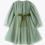 Vestito da bambina realizzato con due strati di tulle: il primo presenta dei micro glitter stampati mentre il secondo in tinta unita, crea struttura. Il taglio ampio dona un effetto a pieghe e vaporoso e la cinturina in vita definisce la silhouette.