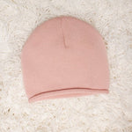 Modello di berretto neonato cipria lavorato in maglia rasata e arricchito da un delicato e sensibile ricciolino sul fondo che garantisce una perfetta vestibilità senza stringere la testa.