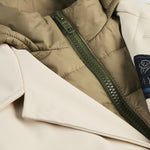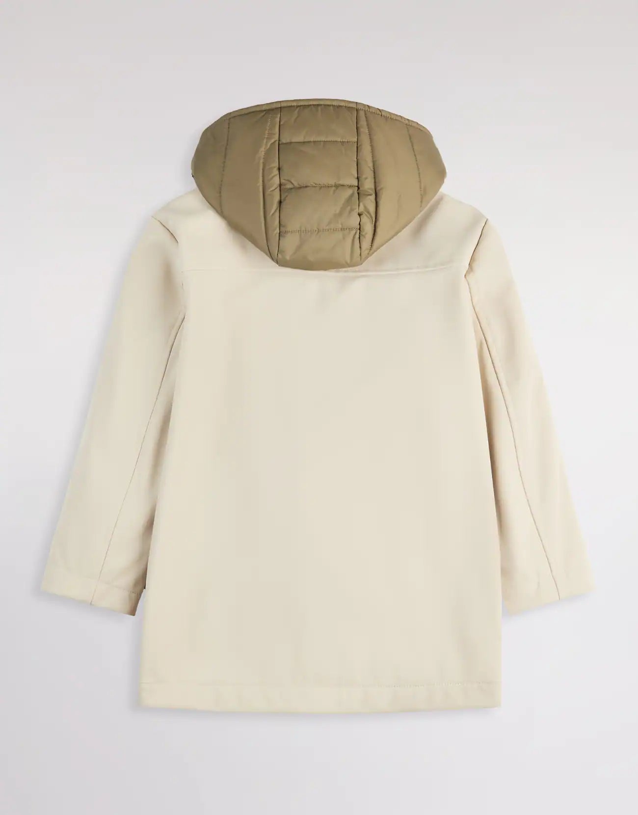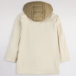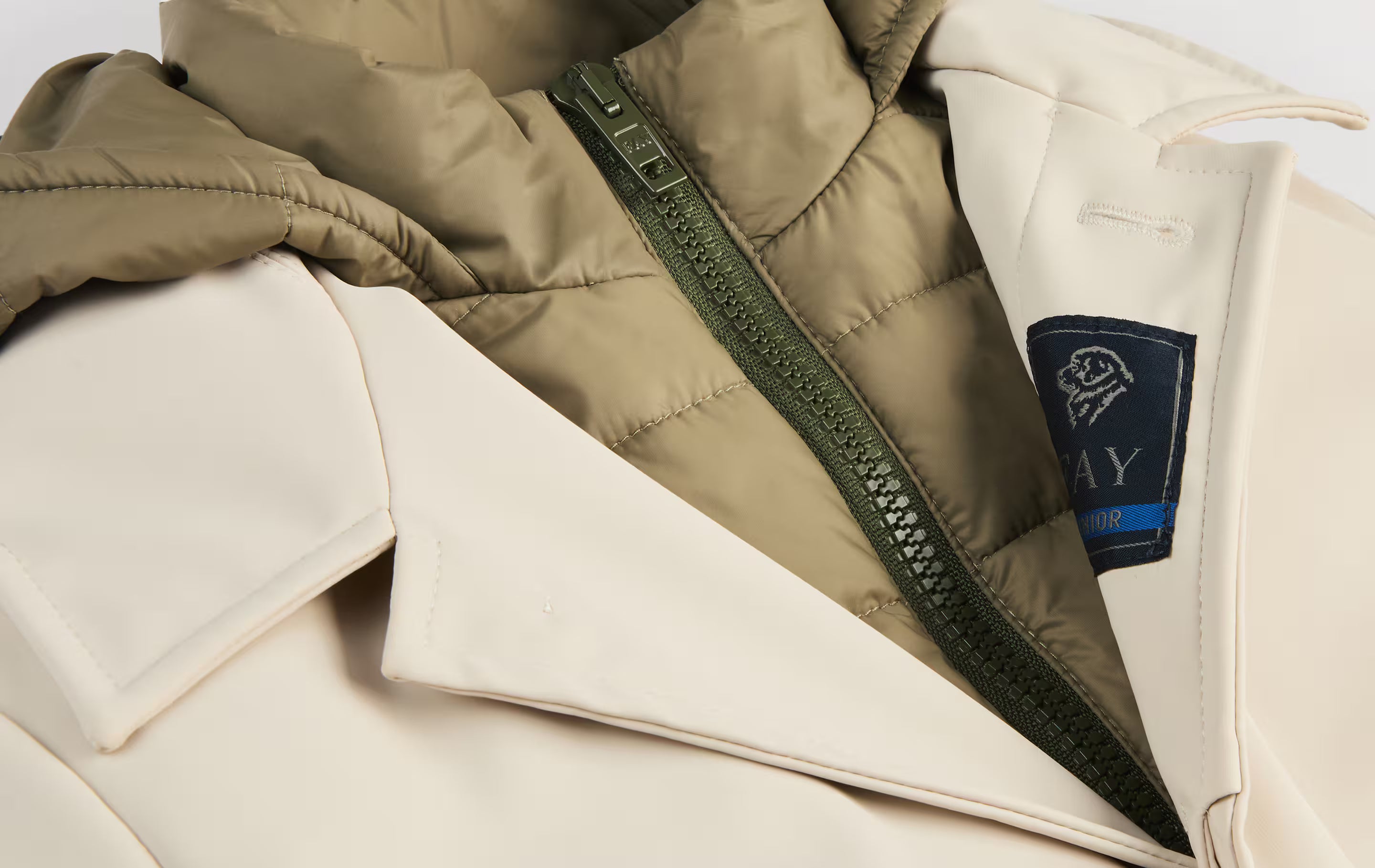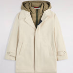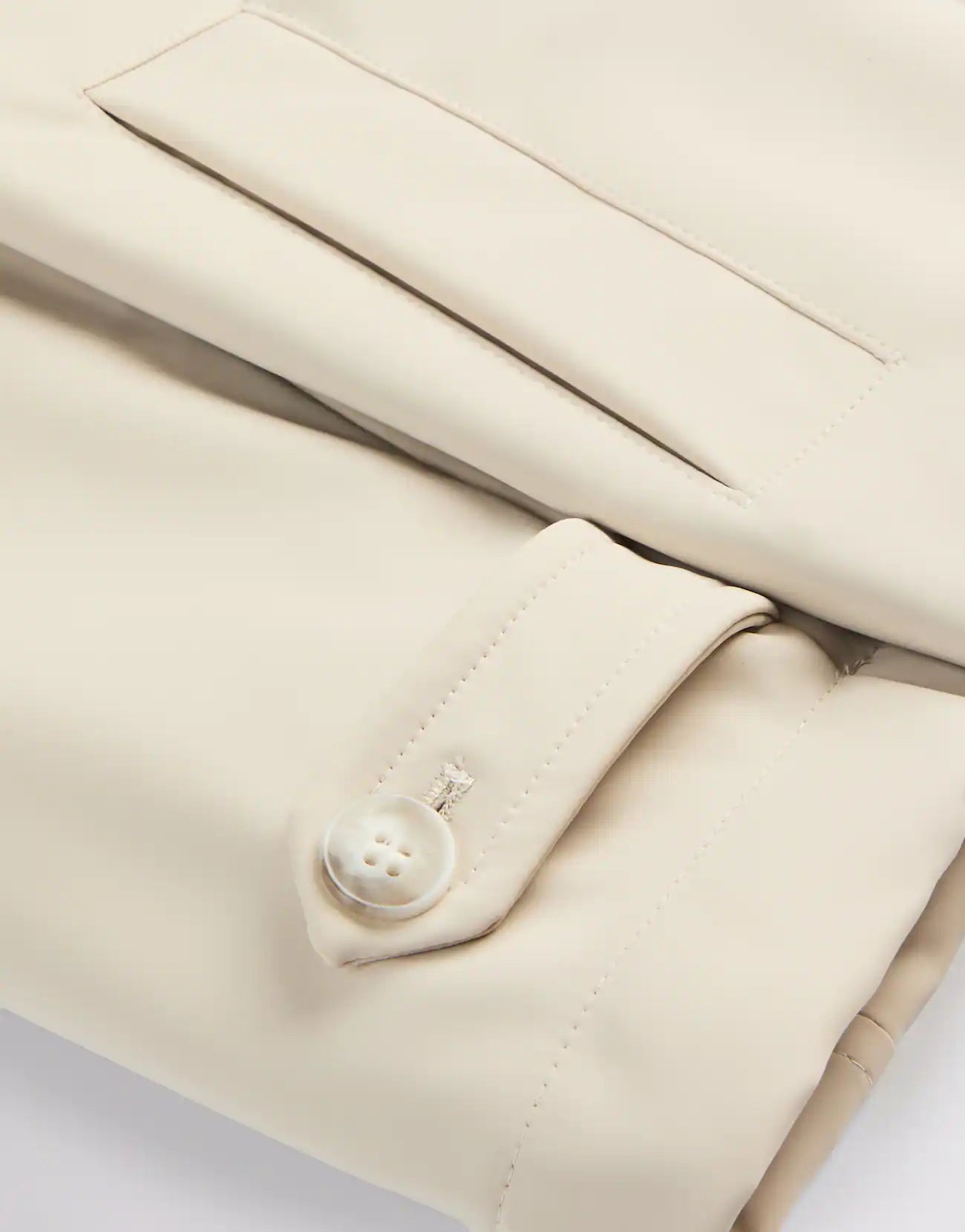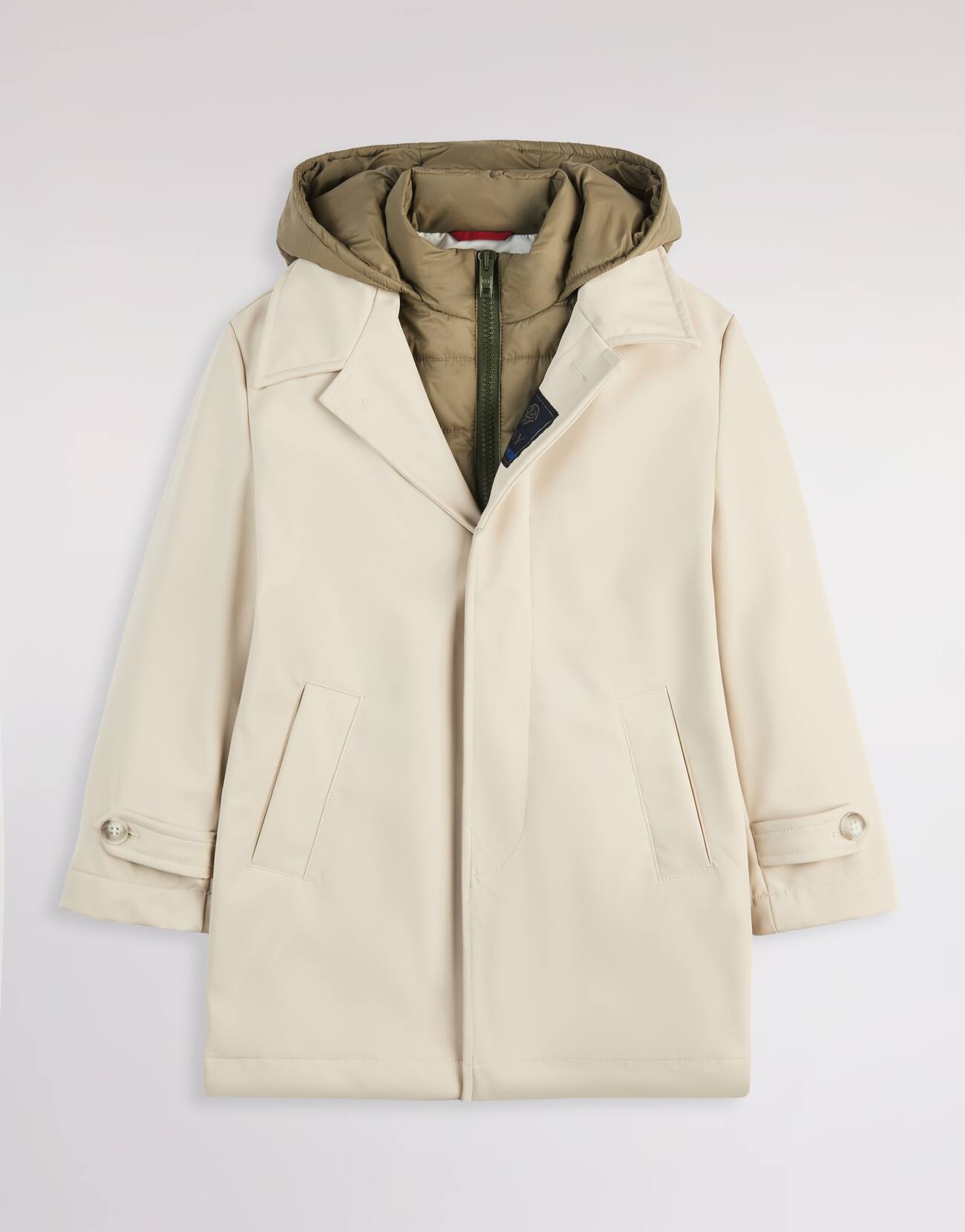 Iconico impermeabile double front in jersey spalmato, caratterizzato da bottoni nascosti e una pettorina trapuntata con cappuccio e zip. Dotato di tasche oblique, presenta polsini con fascetta e bottone.
