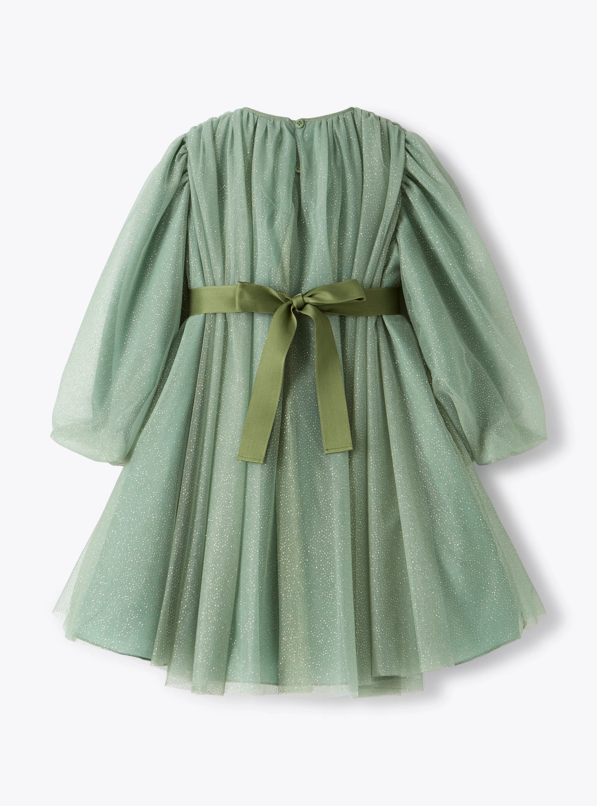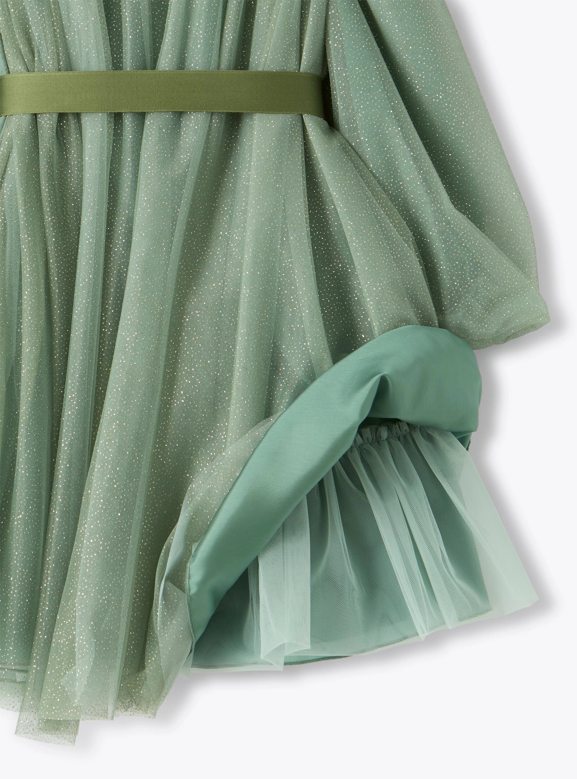 Vestito da bambina realizzato con due strati di tulle: il primo presenta dei micro glitter stampati mentre il secondo in tinta unita, crea struttura. Il taglio ampio dona un effetto a pieghe e vaporoso e la cinturina in vita definisce la silhouette.