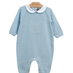 Tutina celeste in filo di cotone, a maniche lunghe, con colletto peter pan in popeline di cotone bianco, bottoni in madreperla sul retro e tra le gambe, polsini e caviglie a costine. È decorata con orsetto celeste sulla parte anteriore. Made in Italy