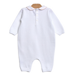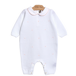 Tutina in filo di cotone con pois ricamati a contrasto cipria. Colletto in cotone profilato.