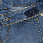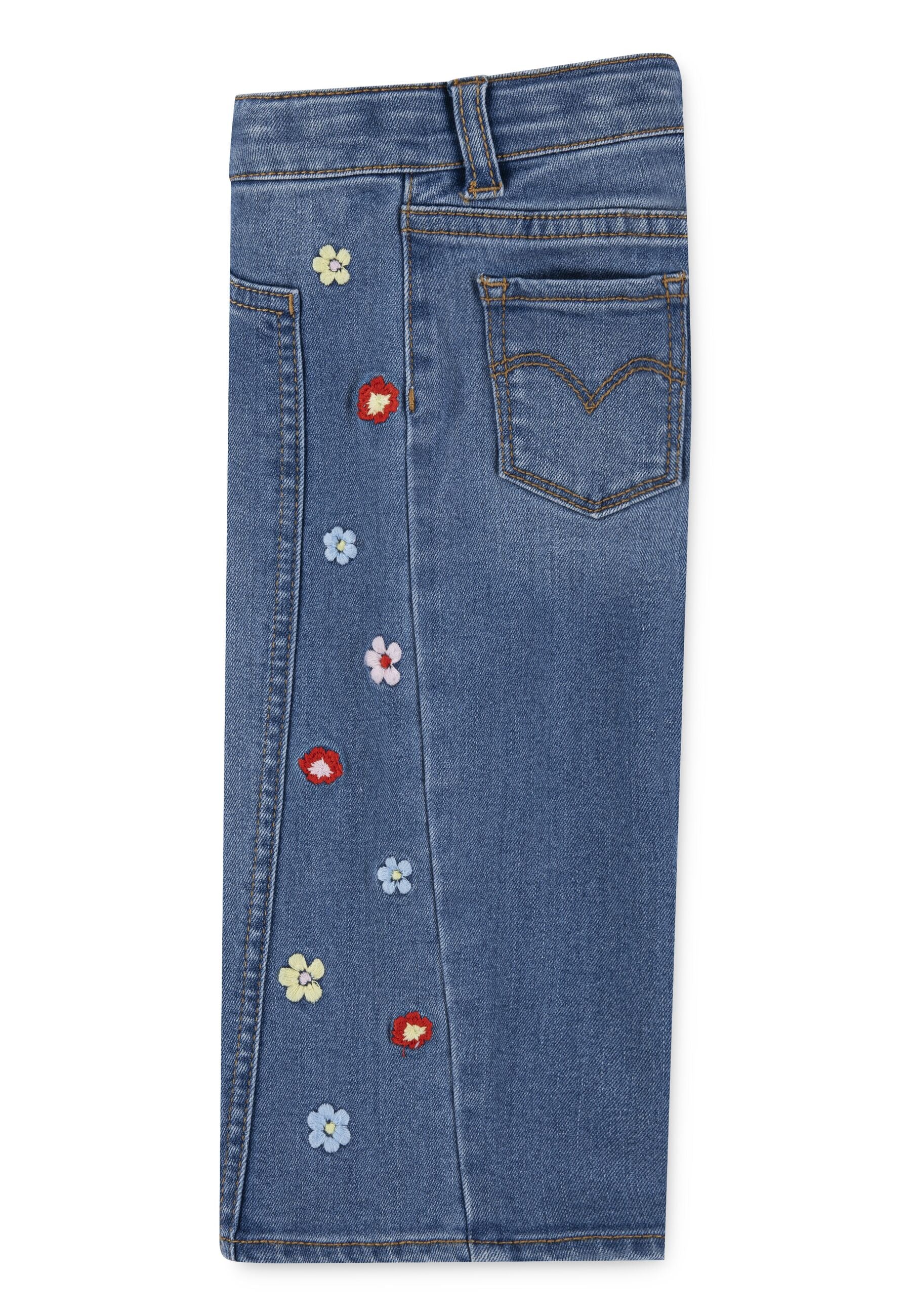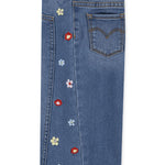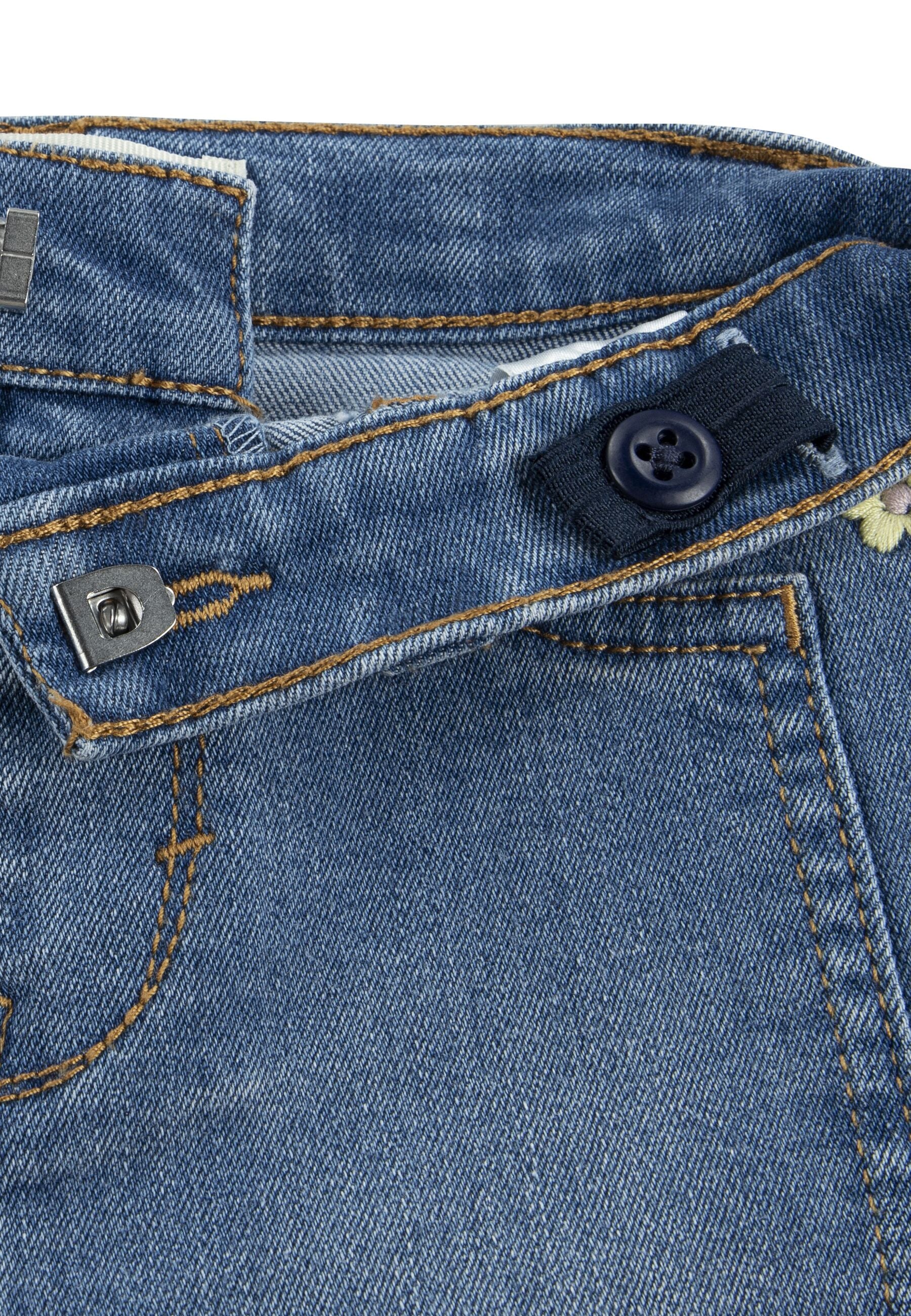 • Jeans in denim blu con vestibilità comoda e dettagli ricamati di fiori colorati lungo la gamba, per un tocco allegro e femminile.