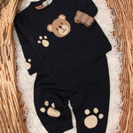 Il nuovo completino per neonati presenta un maglioncino girocollo con apertura sul retro e un simpatico e grazioso orsetto sul davanti con orme sulle maniche ed un pantalone morbido e lungo con orme sul davanti.