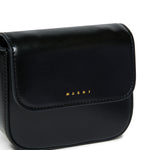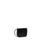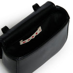 Borsa nera in ecopelle, con patta frontale, bottone magnetico e tracolla regolabile. È decorata con logo frontale. Dimensioni (L x A x P): 14cm x12,5cm x4,5cm